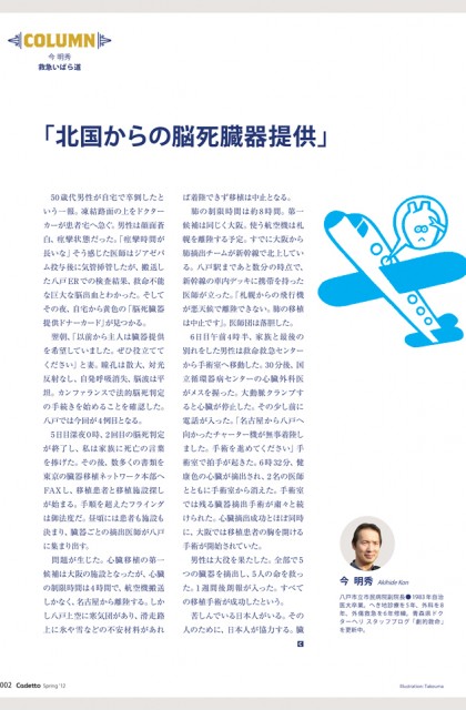 今 明秀さんのコラム「北国からの脳死臓器提供」の挿絵 日経BP社 刊 Cadetto デザイン:LaNTA DESIGN