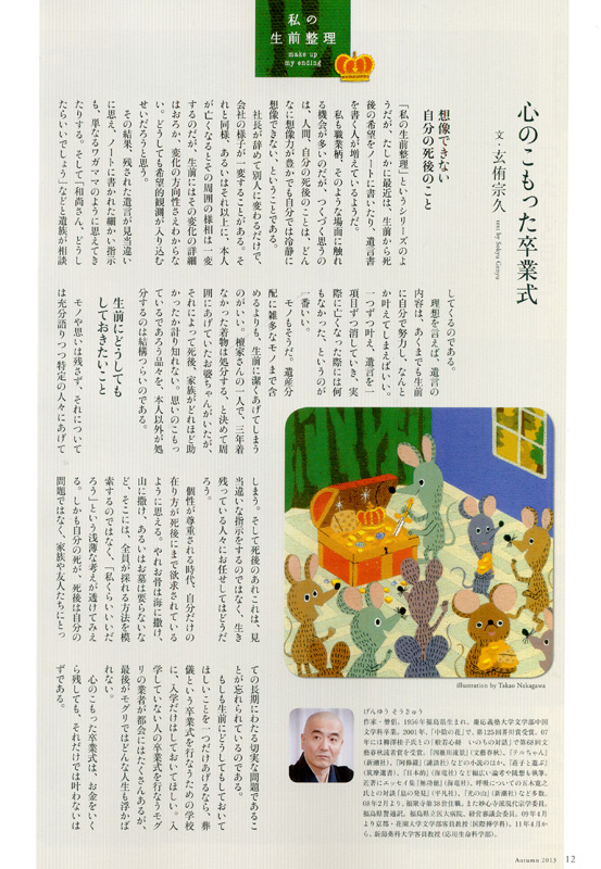 連載中の『como le va?』の「私の生前整理」秋号の挿絵を中川貴雄が手がけました。 今回のコラムは、玄侑宗久さんです。